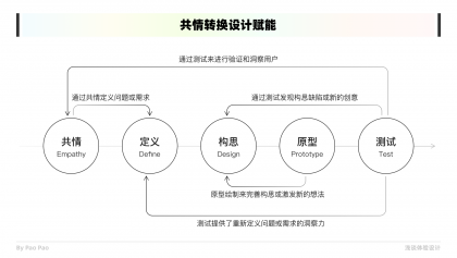 最后便是共情結(jié)果如何應(yīng)用到設(shè)計(jì)之中,將共情結(jié)果賦能到產(chǎn)品設(shè)計(jì)也是共情工作的價(jià)值所在。通常這套流程是共情->定義->構(gòu)思->原型->測試,在這個(gè)整個(gè)過程中隨時(shí)是可以返回到前面其他階段中反復(fù)打磨的,而共情作為一個(gè)起點(diǎn)也揭示了其重要性。我們一切的共情工作皆為了能夠優(yōu)化和解決產(chǎn)品的問題,使得產(chǎn)品體驗(yàn)?zāi)軌蚋茫@是我們?cè)隗w驗(yàn)設(shè)計(jì)中不斷去共情的初衷。