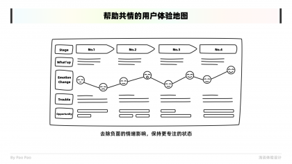 圖表、筆記、錄制設(shè)備是幫助我們共情的最好工具,在不同的場景下,這些工具能夠幫助我們更好的收集信息,并且便于我們思考和共情。我們?cè)诙虝r(shí)間能記住的信息是有限的,這也是為什么我們會(huì)用到7±2這種定律去控制信息量的原因。以用戶體驗(yàn)地圖為例,在記載用戶體驗(yàn)產(chǎn)品的過程中,便是一種很好的共情輔助工具,它能夠按照使用步驟或階段記載用戶使用情況和情緒變化等反饋。