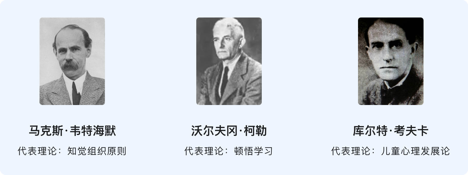 格式塔的德文為“Gestalt”,意思為「形狀」和「圖形」,在心理學(xué)中可以看作是任何一種被分離的整體。格式塔心理學(xué)的研究源于視知覺(jué),是現(xiàn)代認(rèn)知主義學(xué)習(xí)理論的先驅(qū),為后來(lái)的社會(huì)心理學(xué)的發(fā)展打下了堅(jiān)實(shí)的基礎(chǔ),其創(chuàng)始人是韋特海墨、考夫卡和苛勒。