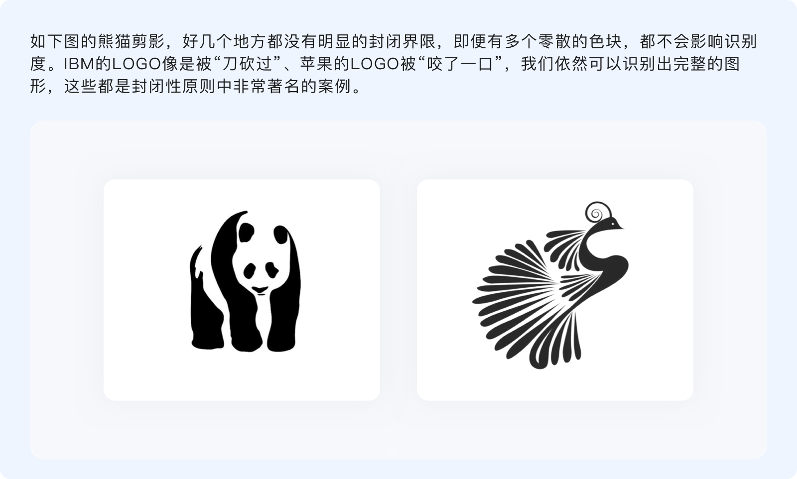 封閉性原則指出,人們的視覺(jué)系統(tǒng)傾向于將不完整的局部當(dāng)做一個(gè)整體來(lái)感知。看起來(lái)與連續(xù)性有諸多相似,不過(guò)連續(xù)性是通過(guò)物體的形狀和運(yùn)動(dòng)方向、按照視覺(jué)慣性來(lái)制定閉合規(guī)律,而封閉性則并無(wú)特定規(guī)律,只要把握好不完整物體的尺度、使各元素之間相互輔助,就能讓其與我們認(rèn)知模型中的原型匹配。