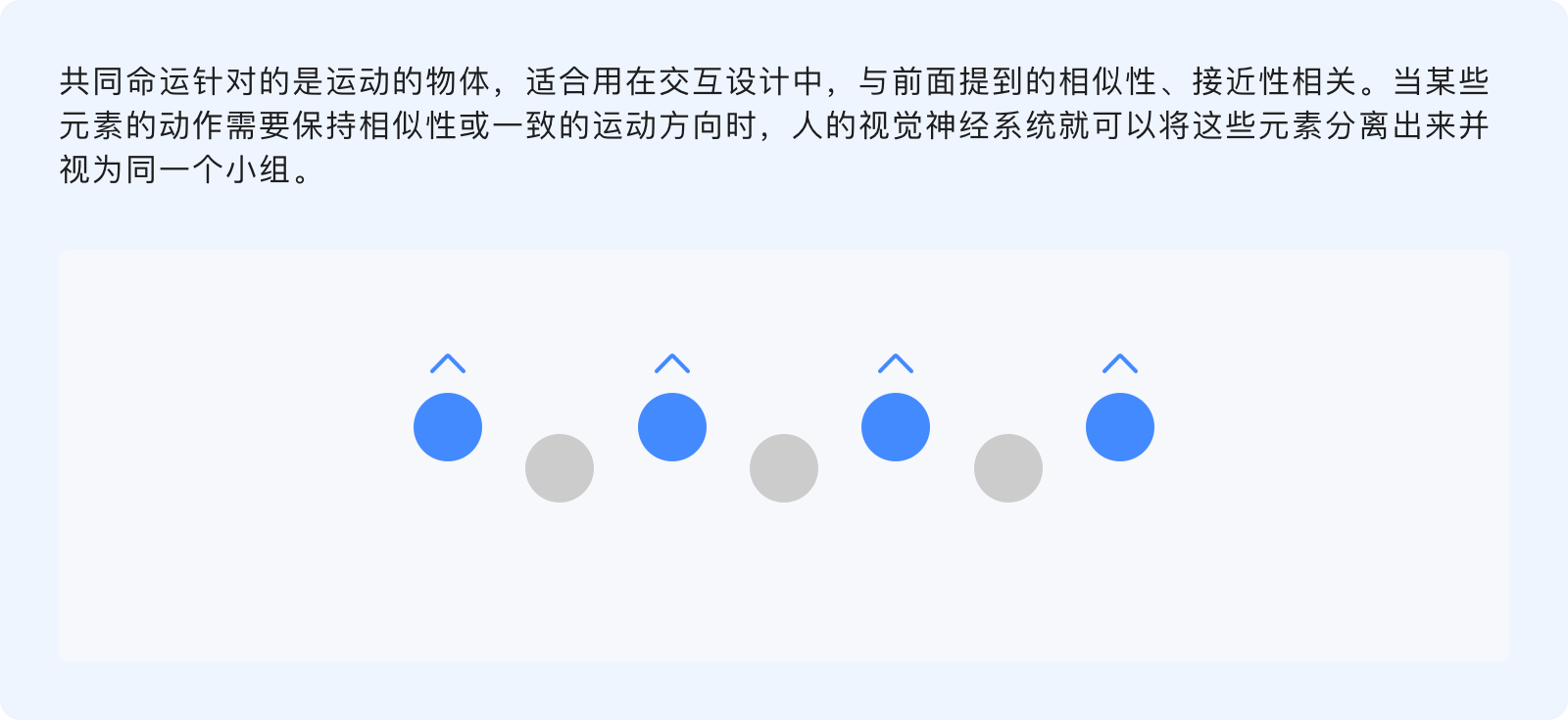 共同命運(yùn)原則指出,人們傾向于將具有共同運(yùn)動(dòng)形式的事物感知為一個(gè)彼此相關(guān)的整體,無(wú)論元素之間的距離有多遠(yuǎn)、或其他屬性(形狀、顏色、大小)各異,但只要沿著相同的方向、相同的速度運(yùn)動(dòng),共同命運(yùn)就會(huì)將其歸類(lèi)。