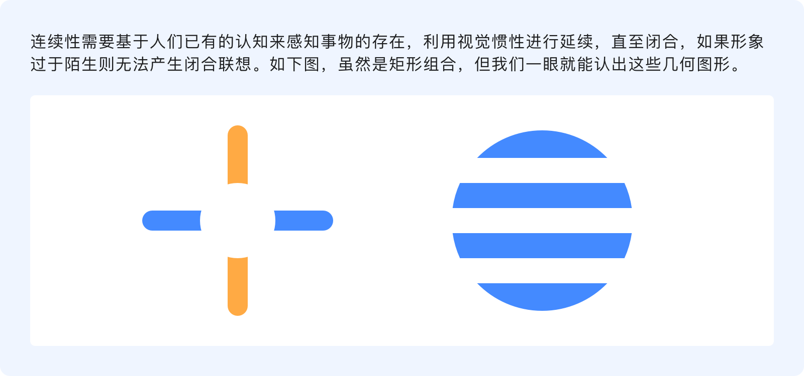 連續(xù)性原則指出,人的視覺(jué)傾向于完整的連接一個(gè)圖形,而不是零散的碎片,通過(guò)感知事物的形狀和運(yùn)動(dòng)方向?qū)⒎稚⒌脑剡B接在一起,使直線繼續(xù)成為直線、曲線繼續(xù)成為曲線并朝著特定的方向延續(xù)。