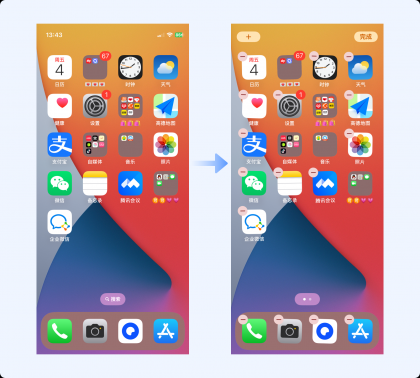 移動(dòng)端產(chǎn)品中有很多這樣的案例,如iOS系統(tǒng)中,長(zhǎng)按刪除某個(gè)APP時(shí),所有桌面圖標(biāo)會(huì)抖動(dòng)、且左上角都有一個(gè)相同的刪除圖標(biāo),通過(guò)一致性的動(dòng)作告知用戶(hù)圖標(biāo)的可操作狀態(tài),非常直觀。
