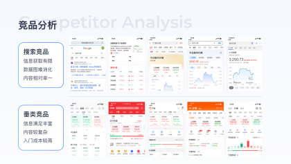 設計優化思路:結合競品優劣勢可得出,需要在提高信息豐富度的同時,考慮小白用戶的入門成本,用更可視化及簡潔的設計語言輔助用戶快速獲取有效需求信息。