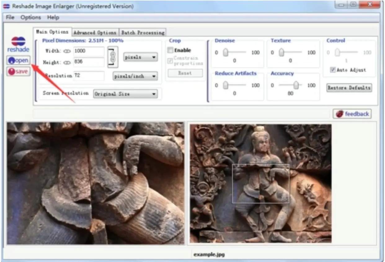 - 工具八:Reshade Image Enlarger Reshade Image Enlarger是一款功能強大的圖像放大工具,它基于深度學習技術,能夠智能識別圖像細節,并進行高質量的放大處理。該工具還提供了多種放大模式和參數調整選項,使用戶能夠根據具體需求進行個性化的圖像放大處理。