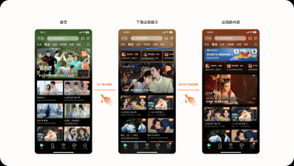 2.1.5設(shè)計亮點(diǎn):下拉刷新新玩法大多數(shù)產(chǎn)品下拉都為刷新界面操作,但騰訊視頻對下拉進(jìn)行兩部交互操作,用戶下拉到第一個階段會出現(xiàn)提示"下拉發(fā)現(xiàn)更多好玩"當(dāng)前這時用戶松手可以進(jìn)行常規(guī)刷新操作, 但用戶看到這樣的提示會更想知道在向下拉到會帶來怎么的內(nèi)容,當(dāng)用戶再次下拉后會出現(xiàn)對應(yīng)的內(nèi)容推薦,類似于游戲推廣與熱播劇推廣,賦予用戶驚喜感的同時還能增加廣告收入。