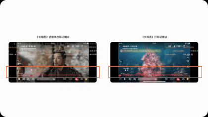 3.2.1設(shè)計亮點(diǎn):定制化進(jìn)度條與標(biāo)記糖點(diǎn)對應(yīng)熱門視頻內(nèi)容,騰訊視頻會定制化進(jìn)度條樣式與進(jìn)度點(diǎn)樣式,(如《長相思》中定制紅色木槿花)讓用戶更加沉浸的觀看體驗(yàn),同時在進(jìn)度條上方有標(biāo)記樣式,用戶點(diǎn)擊會觸發(fā)標(biāo)記動效與糖點(diǎn),所有標(biāo)記的糖點(diǎn)數(shù)據(jù)也會以波動圖的形式顯示在進(jìn)度條上方,提高互動玩法。