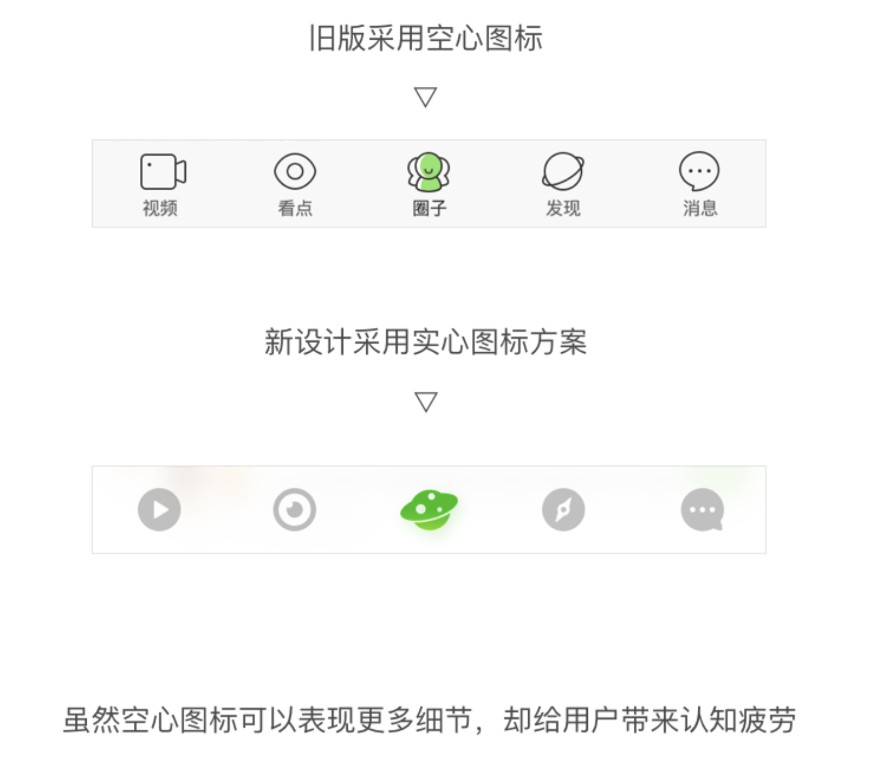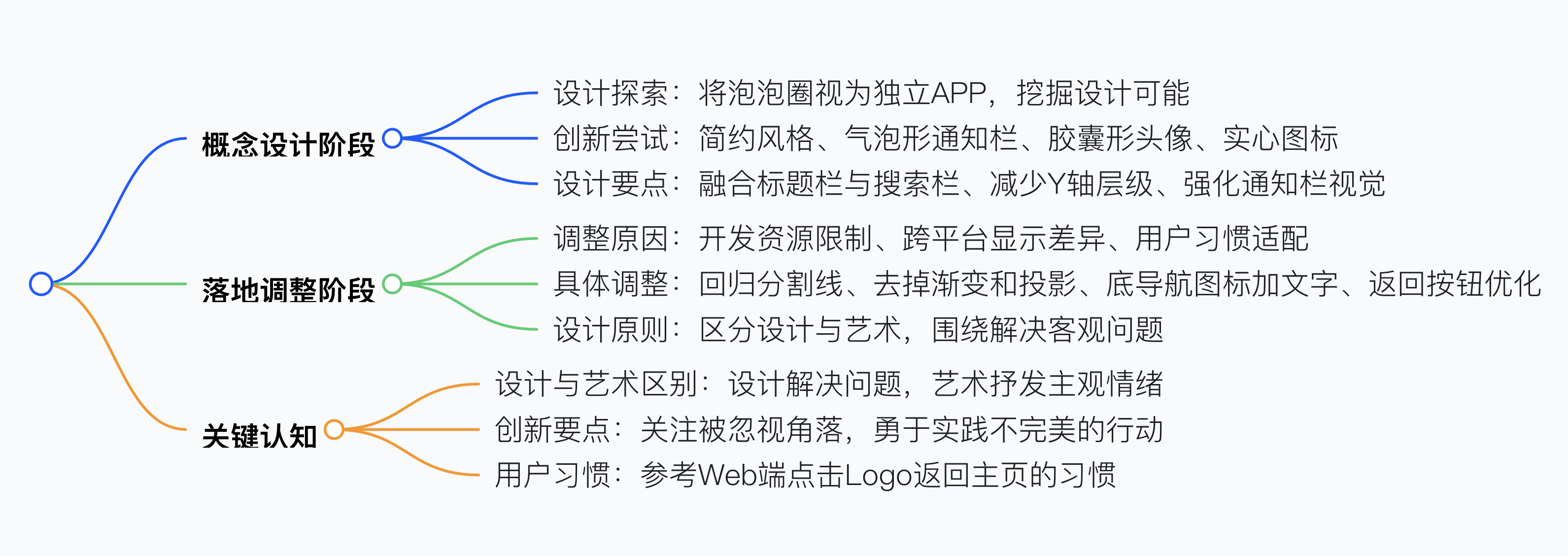 UI 設計思路應先放飛概念探索多種可能,如將泡泡圈視為獨立 APP 進行設計,嘗試簡約風格、氣泡形通知欄、膠囊形頭像、實心圖標等創新設計,再結合實際落實到產品,比如因開發資源和屏幕顯示限制去掉漸變和彌散投影、回歸分割線和返回按鈕,同時要明確設計與藝術的區別,設計需圍繞客觀問題解決,概念稿后要提取可用點推動落地,注重用戶習慣和跨平臺適配,像用愛奇藝 Logo 代替文字返回按鈕。