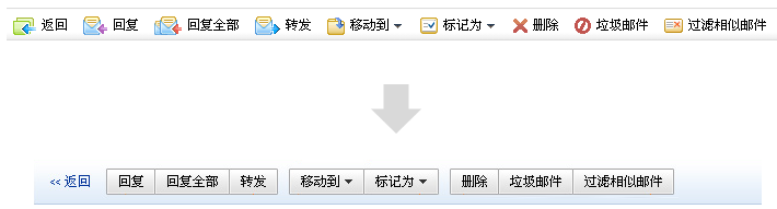 上面的是我們外貿(mào)郵界面目前的狀態(tài),所有的操作都并列擺放,隨著功能的增多,用戶識別的效率大大降低,優(yōu)化的方案是將相關(guān)的操作進(jìn)行分組,正是運(yùn)用關(guān)聯(lián)和并列的信息關(guān)系進(jìn)行設(shè)計(jì)