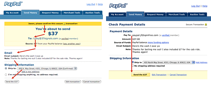 下圖是PayPal支付頁面的一次優(yōu)化過程,老版視覺雖然有層級區(qū)別,卻打亂了完成任務(wù)的視線順序,優(yōu)化后強(qiáng)調(diào)行動點(diǎn),行動前的視覺順序在同一方向上,順序的關(guān)系很明顯,能提升用戶的任務(wù)完成率。