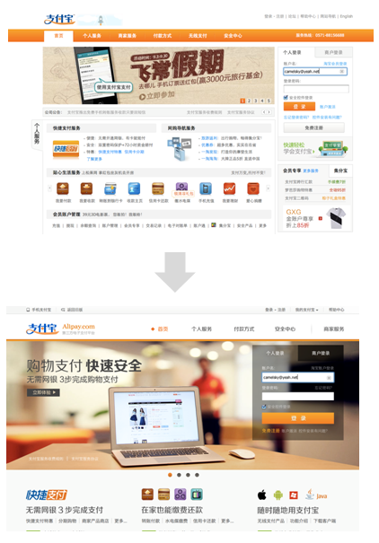 支付寶近期在測試新版首頁,我們來到支付寶首頁最常進(jìn)行的操作就是登錄,而老版首頁視覺第一焦點(diǎn)是導(dǎo)航及活動推廣位,導(dǎo)航只要在固定的位置,用戶在需要時能找到就已經(jīng)達(dá)到目的了,它不應(yīng)該成為頁面的視覺焦點(diǎn),除非用戶經(jīng)常在導(dǎo)航進(jìn)行切換以了解網(wǎng)站提供的服務(wù),在這點(diǎn)上新版首頁弱化了導(dǎo)航及其他應(yīng)用入口,強(qiáng)化支付寶本身的品牌傳達(dá)及登錄行為,很符合主流用戶的行為習(xí)慣