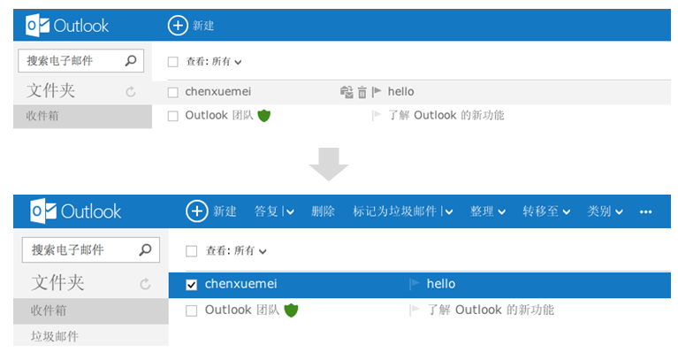 Outlook郵件網(wǎng)頁界面,默認(rèn)情況下對郵件的操作入口都是隱藏的,只有當(dāng)用戶選擇了郵件之后,才會出現(xiàn)對郵件的操作,同時不常用的操作也會被隱藏到下拉菜單中,如“答復(fù)”菜單下隱藏的“全部答復(fù)、轉(zhuǎn)發(fā)”,這種隱藏非核心內(nèi)容的處理方式,能讓用戶更集中于他可關(guān)注的信息和主要操作