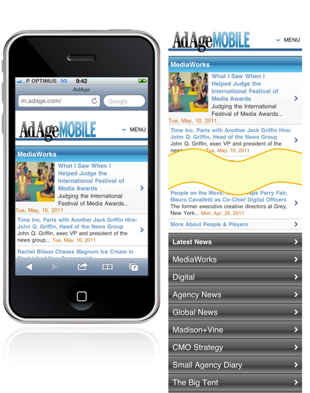 確實是這么回事。移動版本的站點,在布局方面,應該使主要內容盡量多的占據著首屏當中的空間,而導航結構則應該以某種縮略的形式出現在相對次要的位置。Wroblewski通過一個實例來倡導這個設計模式,也就是Ad Age的移動版站點 。其首屏當中,除了網站標題及內容列表之外,右上角的菜單按鈕是界面當中唯一一個交互控制元素。當用戶點擊這個按鈕時,導航列表才會出現在屏幕當中??瓷先?,整個導航列表好像是另外一個界面,但它實際上是被放置在頁面最下方的,而菜單按鈕只是個錨點而已。
