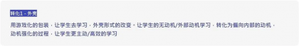 從這個(gè)理論來看,我們的第一個(gè)轉(zhuǎn)化是“外殼”。用游戲化的包裝,讓學(xué)生去學(xué)習(xí),外殼形式的改變。讓學(xué)生的無動(dòng)機(jī)/外部動(dòng)機(jī)學(xué)習(xí),轉(zhuǎn)化為偏向內(nèi)部的動(dòng)機(jī),動(dòng)機(jī)強(qiáng)化的過程,讓學(xué)生更主動(dòng)/高效的學(xué)習(xí)。